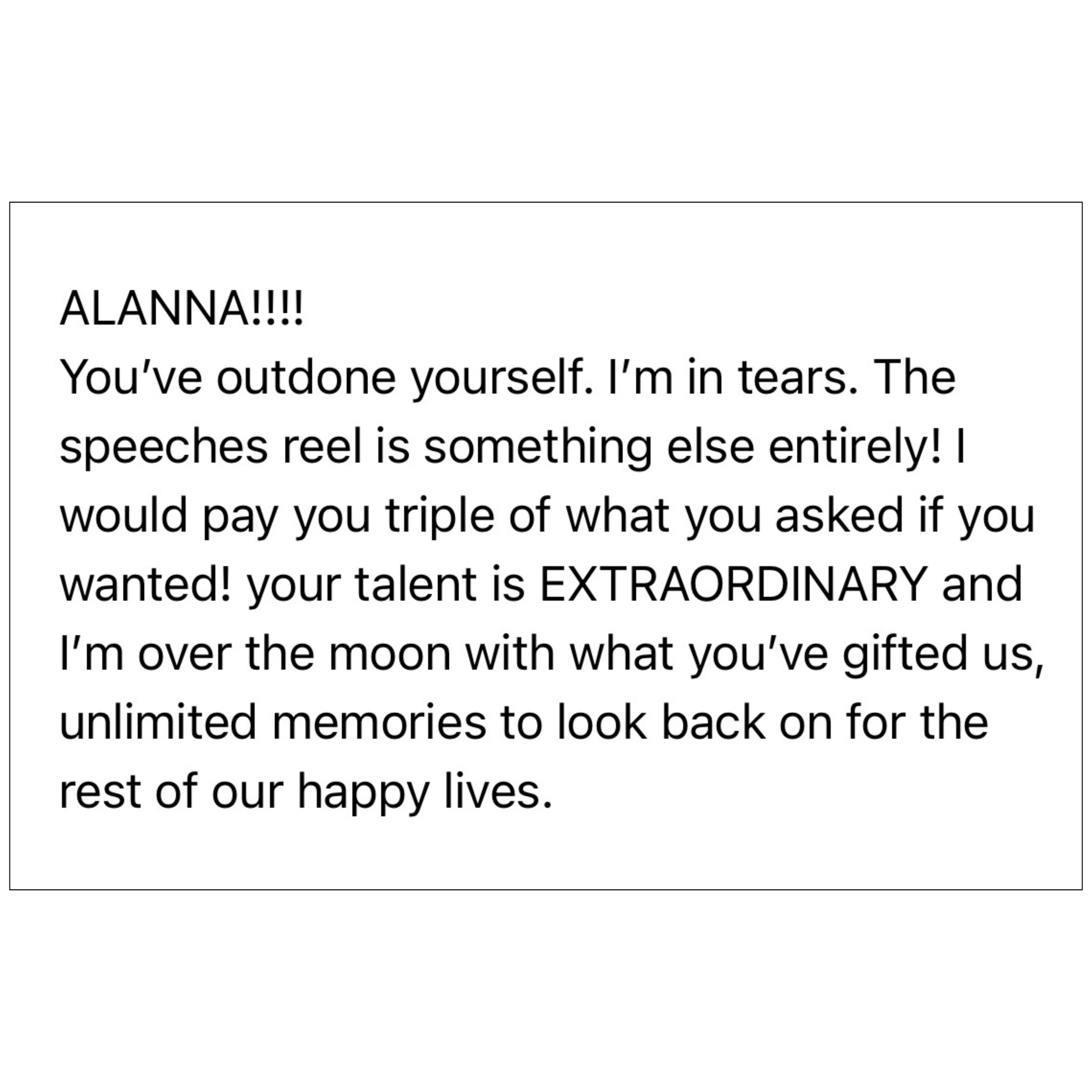 Alanna is my name, and being your personal paparazzi is my aim! Think of me as your unofficial best friend or bridesmaid who captures the raw, candid, scroll-stopping memories you’ll actually want to rewatch (and re-post).