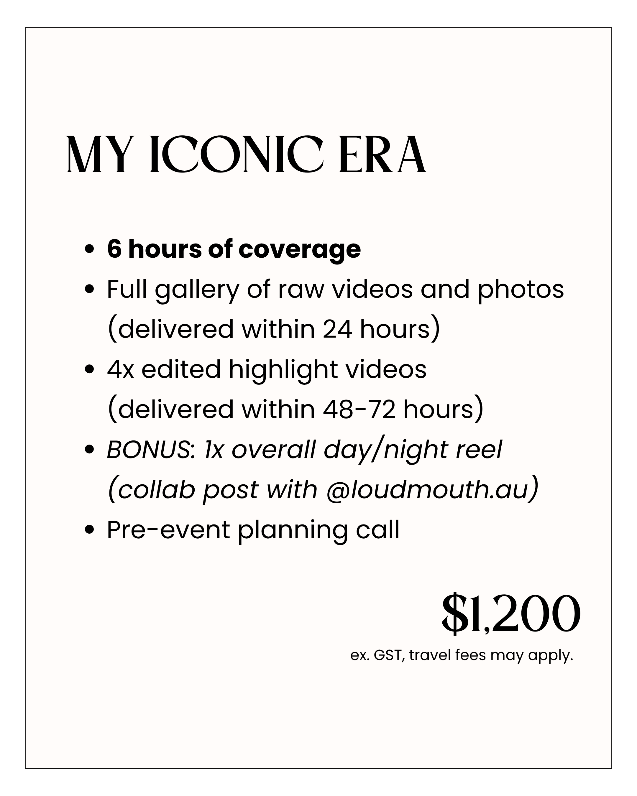 + $100 security bond *ex. GST. Book with any content creator package to save moolah, baby!